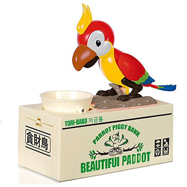 Po vhození mince do otvoru pokladničky, v tomto případě misky na žrádlo, papoušek stojící nad ní začne vyvádět skutečné psí kusy. Vrtět se, „hltat" vhozený peníz a honit ho kolem dokola misky.