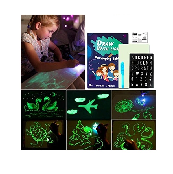 Zábavné malování pro holky i kluky. Rozvíjejte tvůrčí potenciál vašich dětí a pořiďte jim tuto kreslící tabulku. Toto malování se bude dětem líbit. Na tabulku dítě kreslí světelným perem. Jas tahu pera závisí na tom, jakou intenzitou je kresleno. Při kreslení obrázků může dítě zapojit vlastní fantazii a nebo použít šablonu. Nakreslené obrázky se nedají smazat, ale po chvíli začnou samy mizet.
