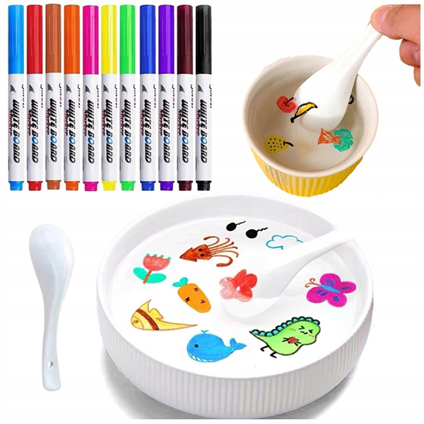 Nakreslete barevným vodním perem požadovaný vzor na misku, lžíci, sklo nebo keramiku, poté jej pomalu vložte do vody a uvidíte, jak plave.