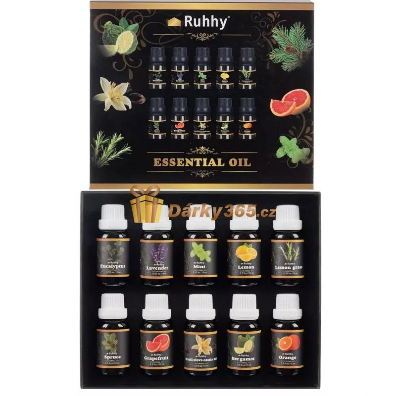 - 10 RŮZNÝCH VŮNÍ – celá sada má 10 různých vůní jako např.: eukalyptus, pomeranč, máta, levandule, borovice, citron, leknín, grapefruit, citronová tráva, bergamot. Vše oleje jsou uzavřeny v lahvičkách o objemu 15 ml .