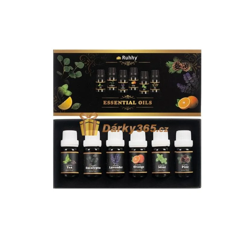 - 6 RŮZNÝCH VŮNÍ – celá sada má 6 různých vůní jako: eukalyptus, pomeranč, čajovník, máta, levandule a borovice. Vše oleje jsou uzavřeny v lahvičkách o objemu 10 ml .