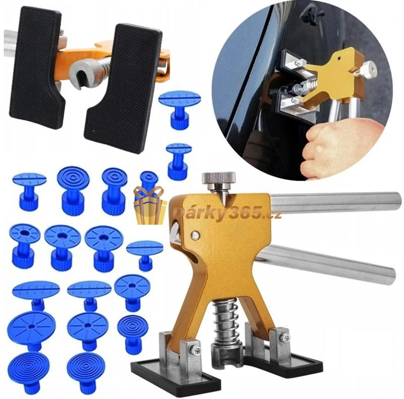 Pomocí této sady je možné mimořádně snadné a efektivní odstranění promáčklin z povrchu karoserie. Zařízení je pečlivě vyrobeno z kvalitních materiálů, se zvláštní pozorností k detailům a precizní povrchovou úpravou, což zaručuje dlouhodobou a efektivní práci nástroje.