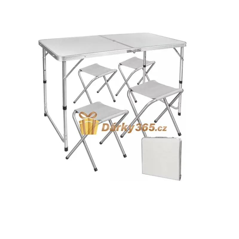 Kempingový set se 4 židličkami, pro děti i dospělé, se bude skvěle hodit na výlety mimo město, ale nejen - díky možnosti úpravy se skvěle hodí jako set na narozeninovou oslavu vašeho dítěte. Váží jen necelých 8 kg a díky možnosti přenášení ve formě kufru s madlem není problém s jeho přepravou. Deska stolu je zároveň kufr, do kterého můžeme schovat židle, má bezpečnostní opatření, která zabrání otevření kufru při přepravě. Stůl je navržen se zajímavým vzorem a je na cesty praktičtější než bílý. Kompaktní rozměry umožňují uskladnění v karavanu, karavanu nebo jednoduše v kufru. Při cestování je velmi důležitá dobrá organizace prostoru, proto je tak důležité, aby výrobek zabíral co nejméně místa.