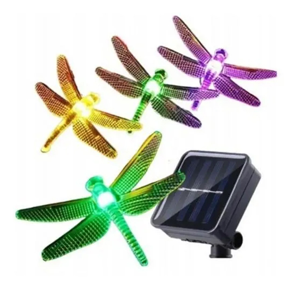 Barevné řetězové LED osvětlení o délce 4,5m ve tvaru 20-ti vážek. Bliká nebo trvale svítí, což může vytvořit zvláštní podmanivou atmosféru. Vestavěný paměťový čip uloží vaše poslední nastavení režimů, takže není nutné jej znovu nastavovat. Díky vodotěsnosti IP65 je možné osvětlení použít k dekoraci jak vnitřních, tak venkovních prostor, zahrady, terasy, schodiště apod. Solární nabíjení – vestavěná baterie a solární panel, který lze libovolně naklopit a zapíchnout do země. Pomocí solární energie k nabíjení ušetříte za elektřinu. Světla se automaticky zapínají ve tmě a během dne se vypínají a efektivní solární panel přeměňuje sluneční světlo na elektrickou energii uloženou ve vestavěné dobíjecí baterii. Integrovaná baterie má velkou kapacitu a po úplném nabití ji lze v noci používat cca 10 hodin.